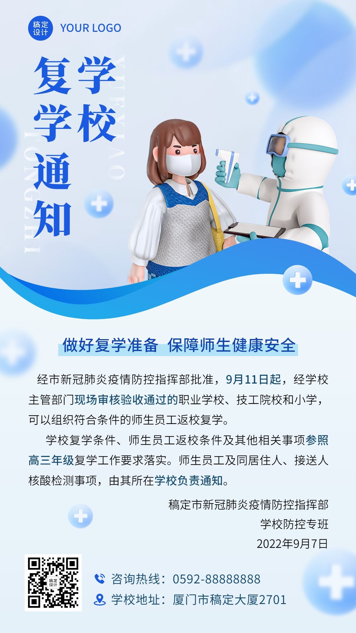最新复学通知摘要:根据最新教育部门的通知,学校将按照疫情防控要求逐步恢复正常教学秩序。学生需按照学校规定的时间和程序返校,同时需遵守防疫措施,如佩戴口罩、勤洗手、保持社交距离等。学校将做好各项防疫工作,确保师生健康安全。具体复学时间和安排请关注学校官方通知。