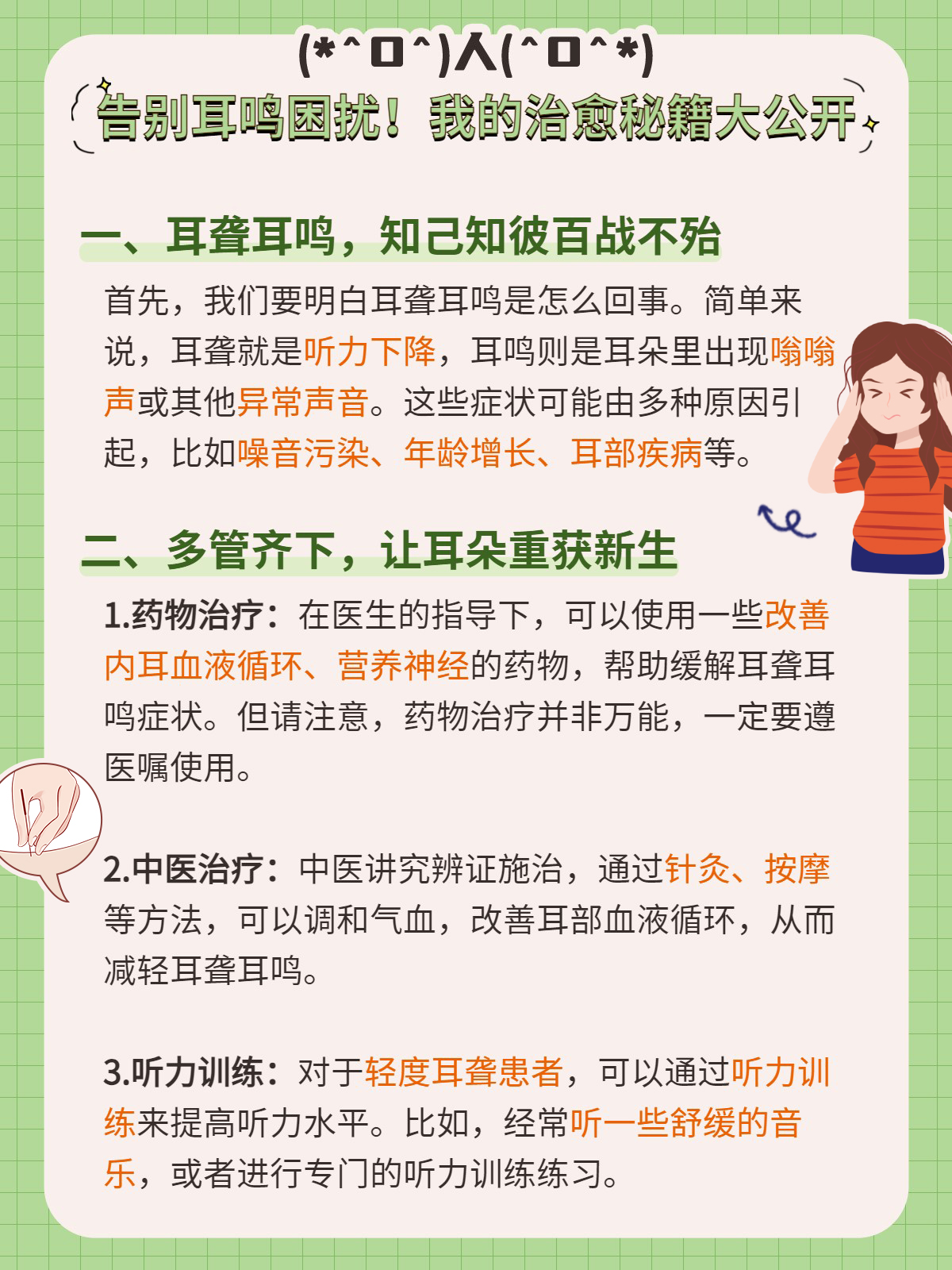 4、康复治疗:包括声音训练、语言训练等,可以帮助患者更好地适应听力损失,提高生活质量。